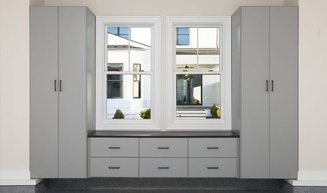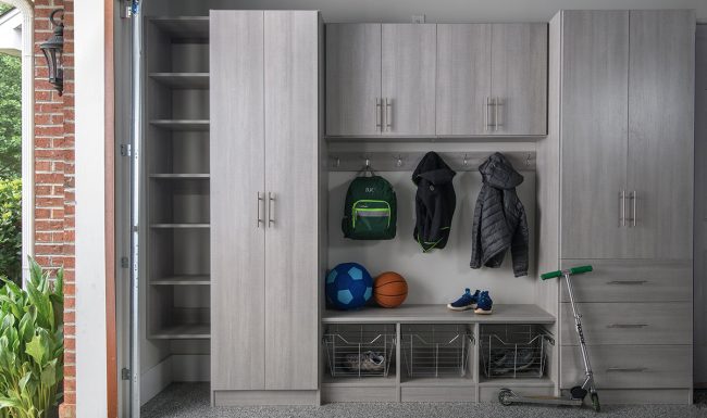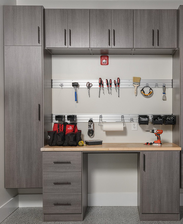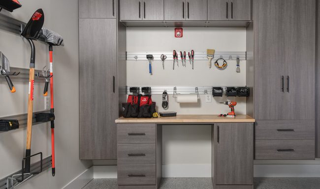You can maintain a garage that is in keeping with your home’s interior by placing cabinetry in the right place and keeping as much behind doors as possible. ClosetPro has a wide range of materials and accessories to choose from, whether you want a high-tech metallic with colored LED lights and stainless steel work surfaces or a warm look with woodgrains and butcherblock.